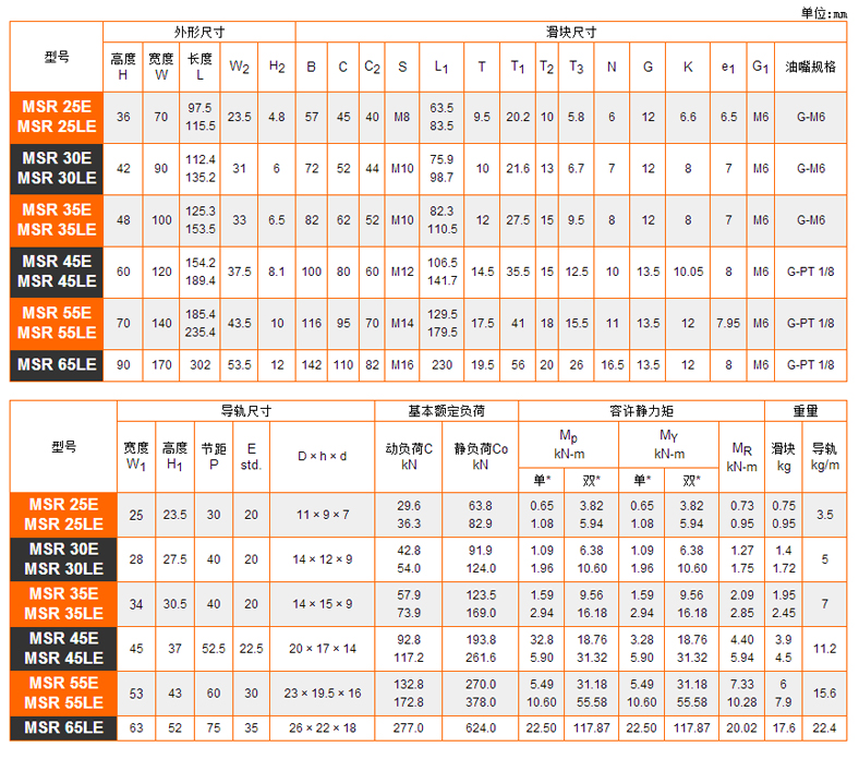 MSR 系列滾柱型直線導軌由于使用滾柱滾動體取代一般的鋼珠滾動體,因此在相同尺寸的線性滑軌上可提供更高的剛性與負載能力,特別適用于講求高精度、高負載與高剛性的設備需求。